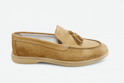 Mocassino in camoscio con nappine di colore beige, fodera agnello Bianco Suola color crema, flessibile plantare in memory estraibile, made in Italy