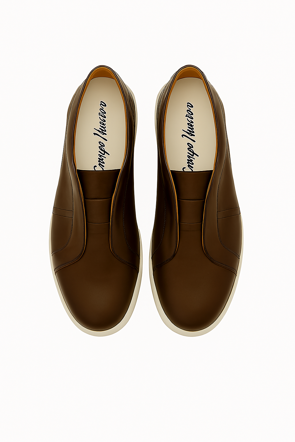 Sneakers in Crust, testa di moro, fodera agnello bianco senza lacci con elastico all’interno si usa come Mocassino Suola leggerissima di colore Off White plantare in memory comodissimo tutto Made in Italy
